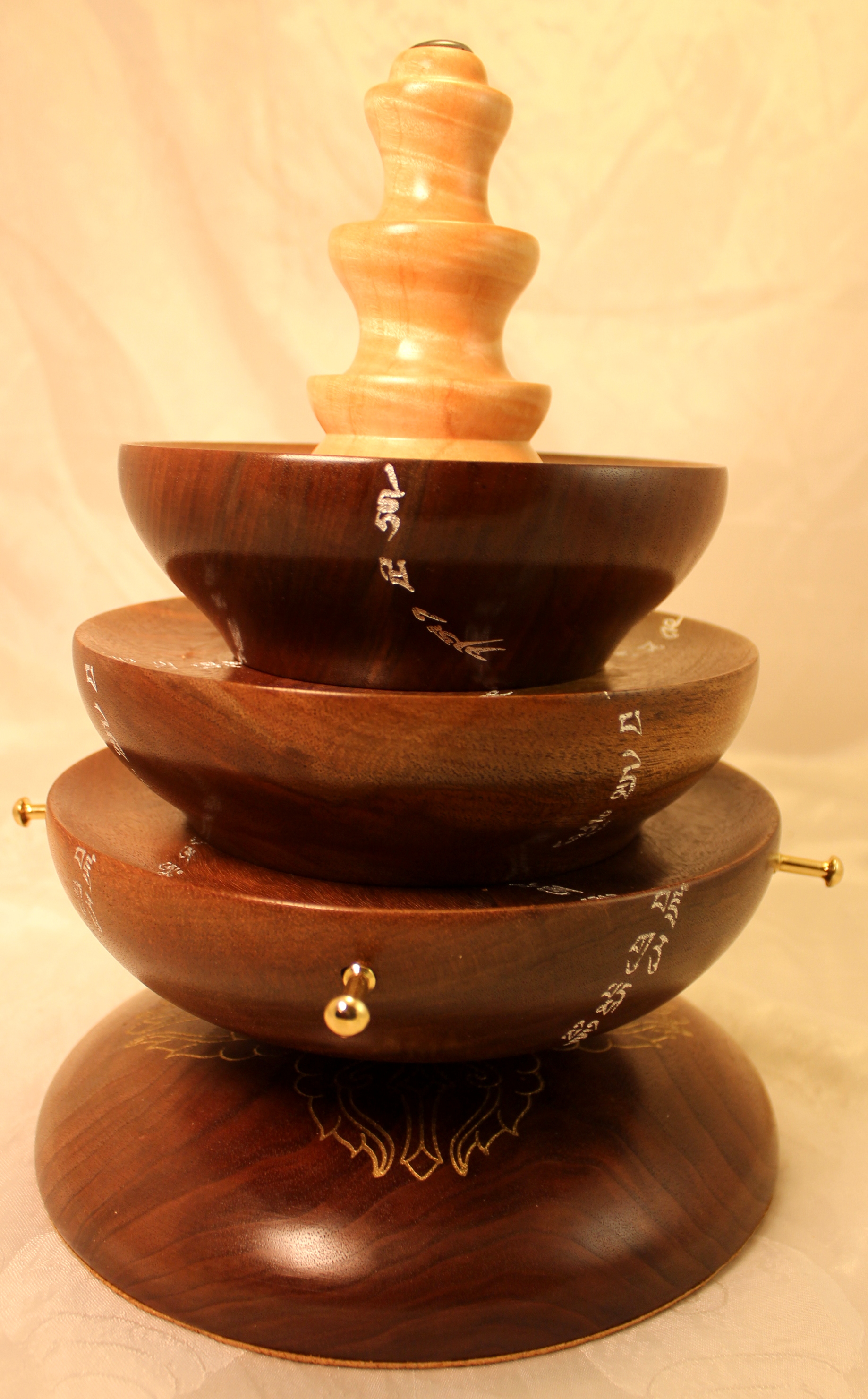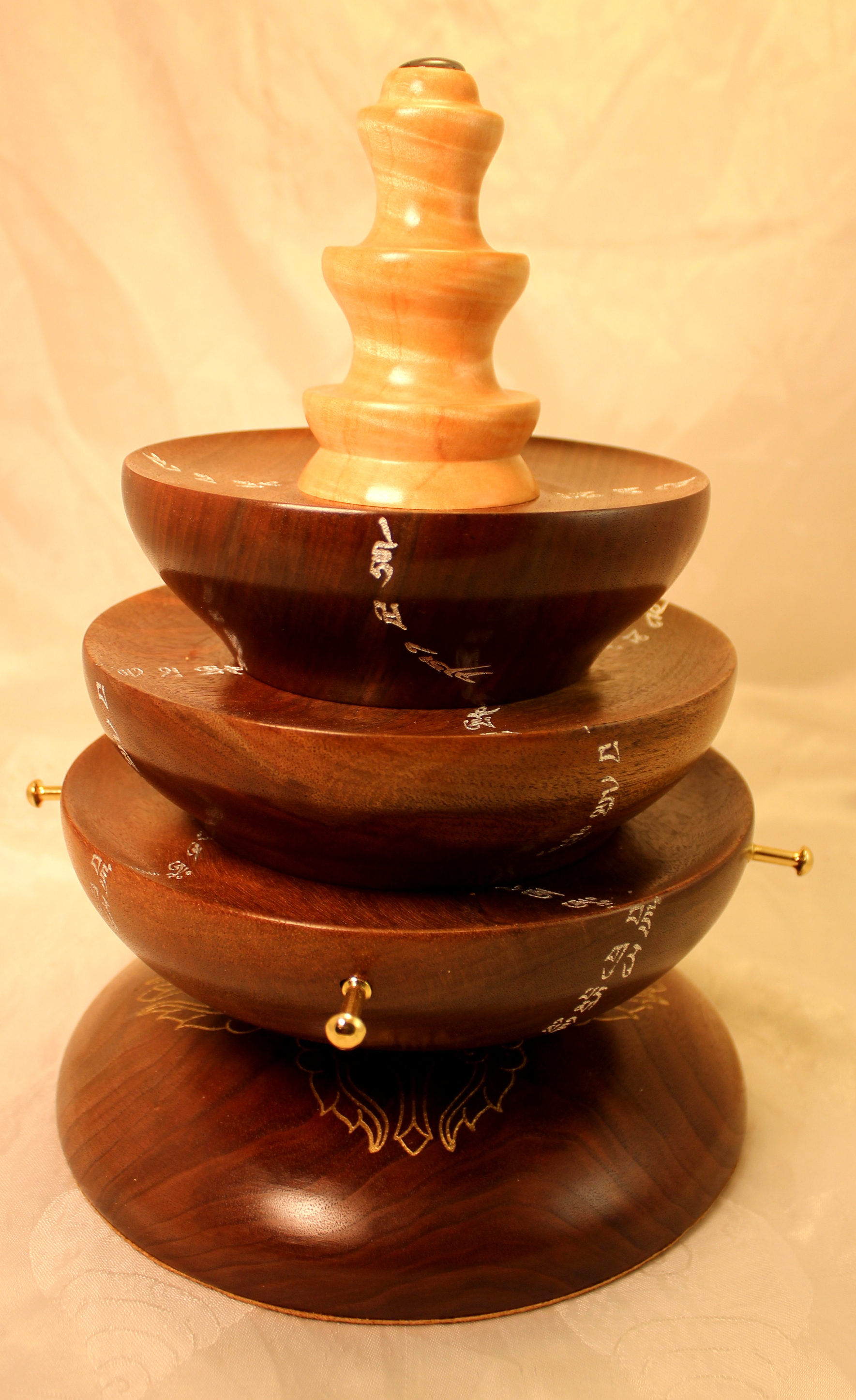 This unique one of a kind prayer wheel is made of sustainably harvested Walnut and Maple woods and a beautiful labradorite cabochon. The shape is made to resemble a fountain, the “fountain of bliss”. Silver mantras are engraved down the outside in a fluidly curving stream resembling flowing water. The mantras engraved correspond to the 3 kayas : Amitabha’s mantra on the top level, the mani mantra of Avalokiteshvara on the second level and the mantra of Guru Rinpoche on the lower level. The base of the prayer wheel is engraved with a large golden crossed vajra or dorje. The top of the fountain is made from a three tiered crown of shimmering quilted maple wood with a beautiful labradorite cabochon mounted into the very top.