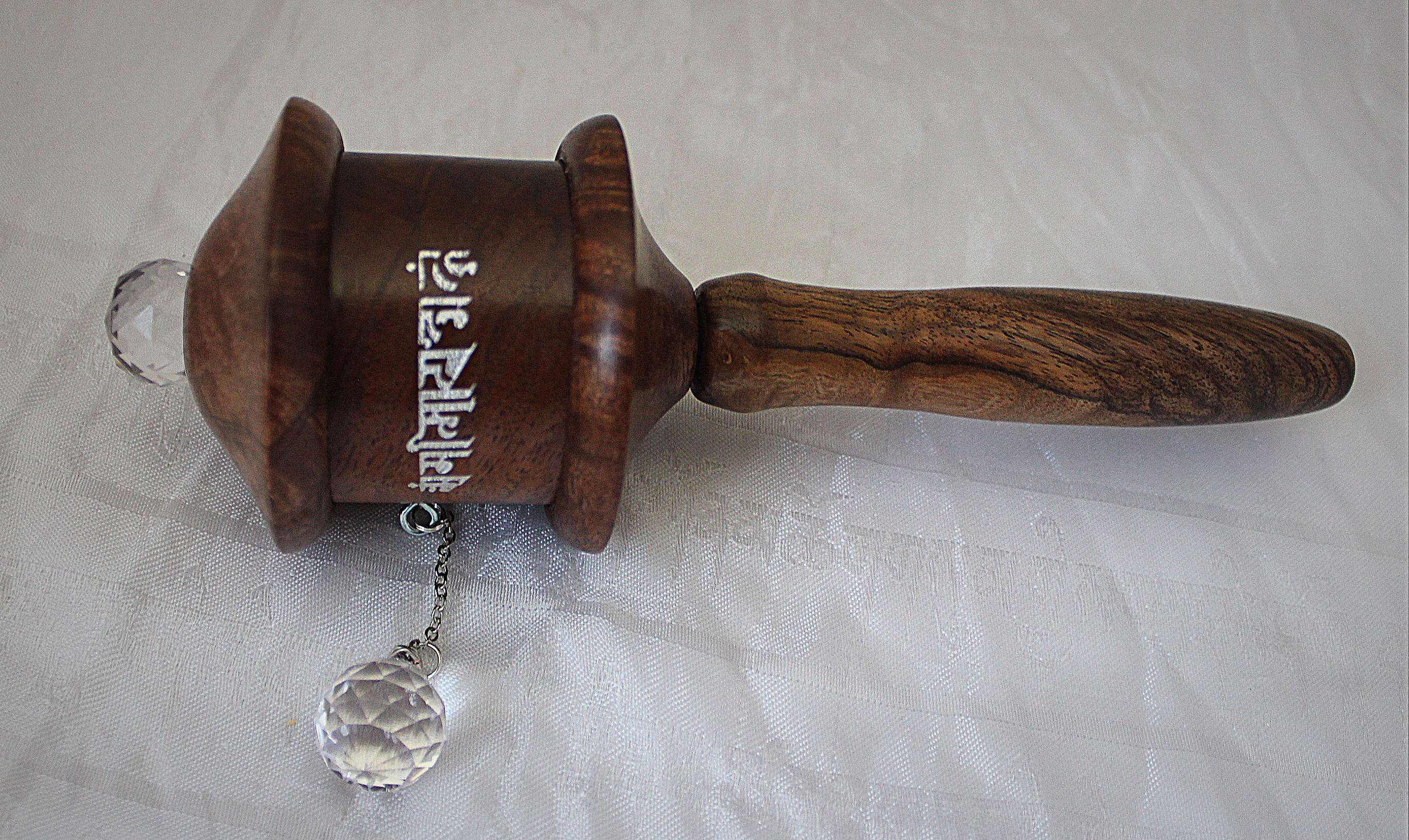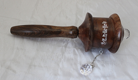 This prayer wheel is made out of walnut wood, sustainably harvested in our home state of Oregon. Inside it contains 25 million Mani mantras and 2 million Green Tara mantras printed on microfilm. It spins effortlessly on high quality lifetime ball bearings using an egyptian crystal as a spinner attached with a sturdy yet elegant chain.