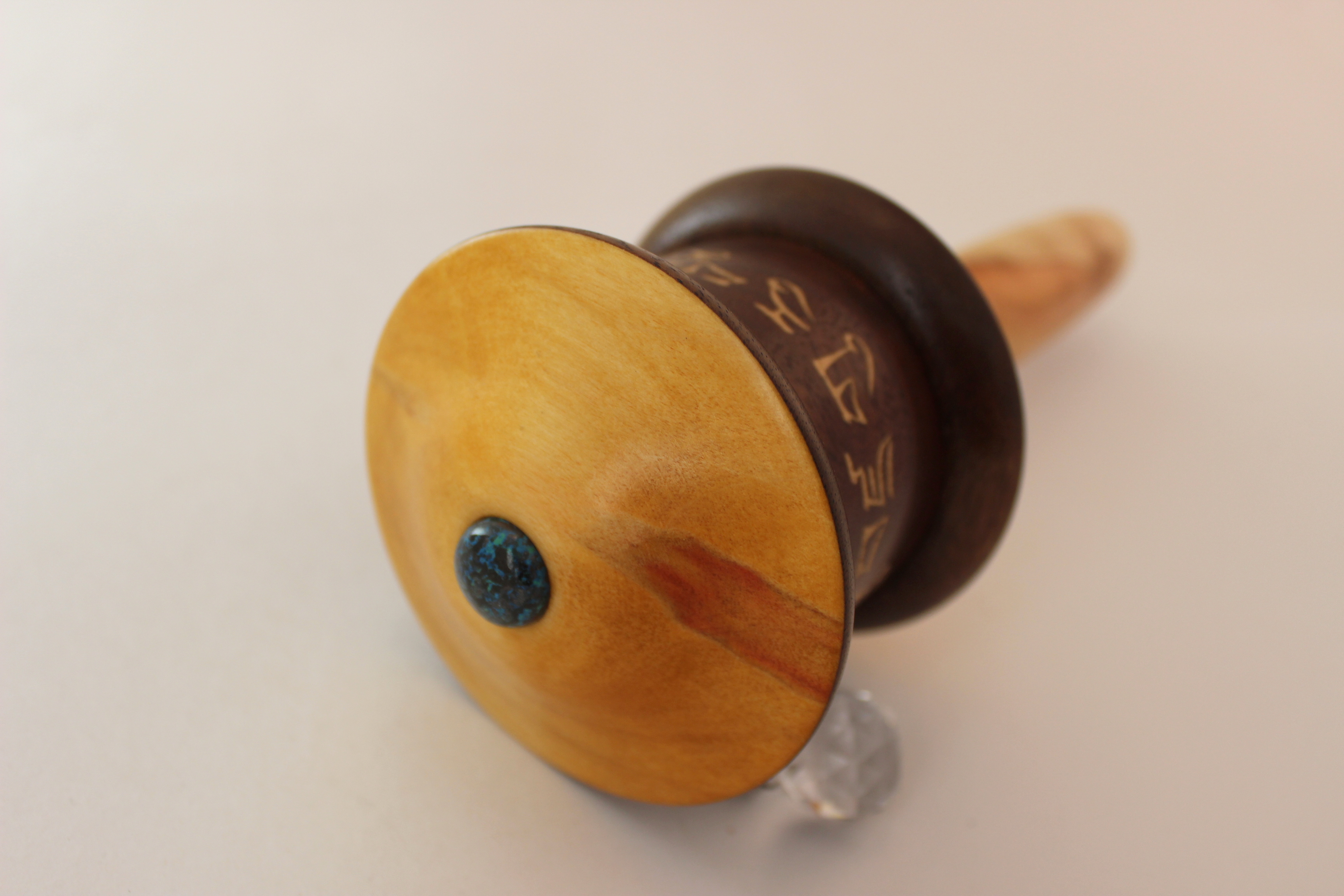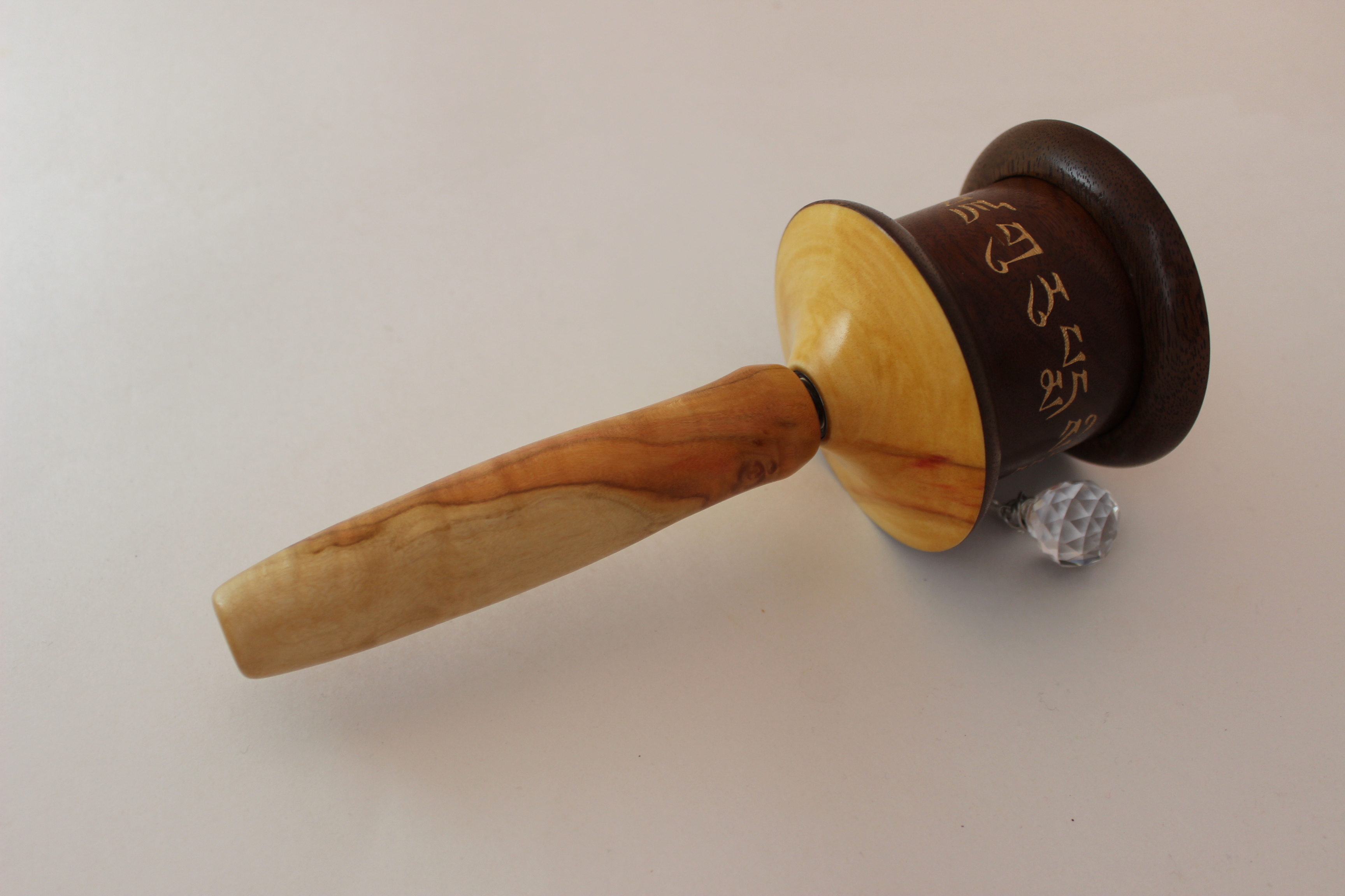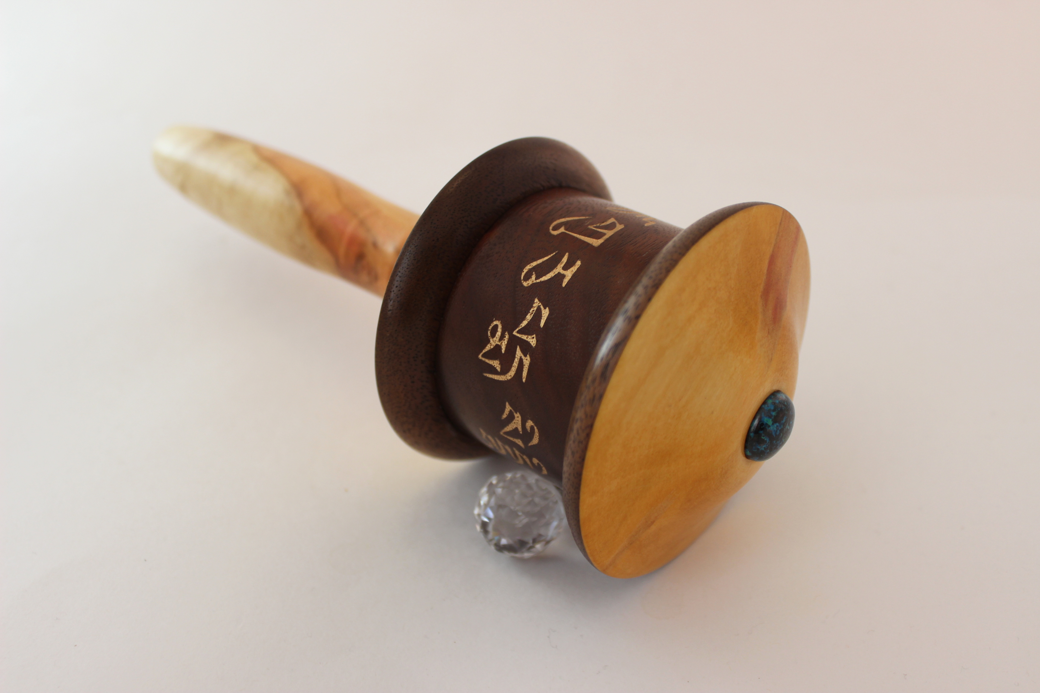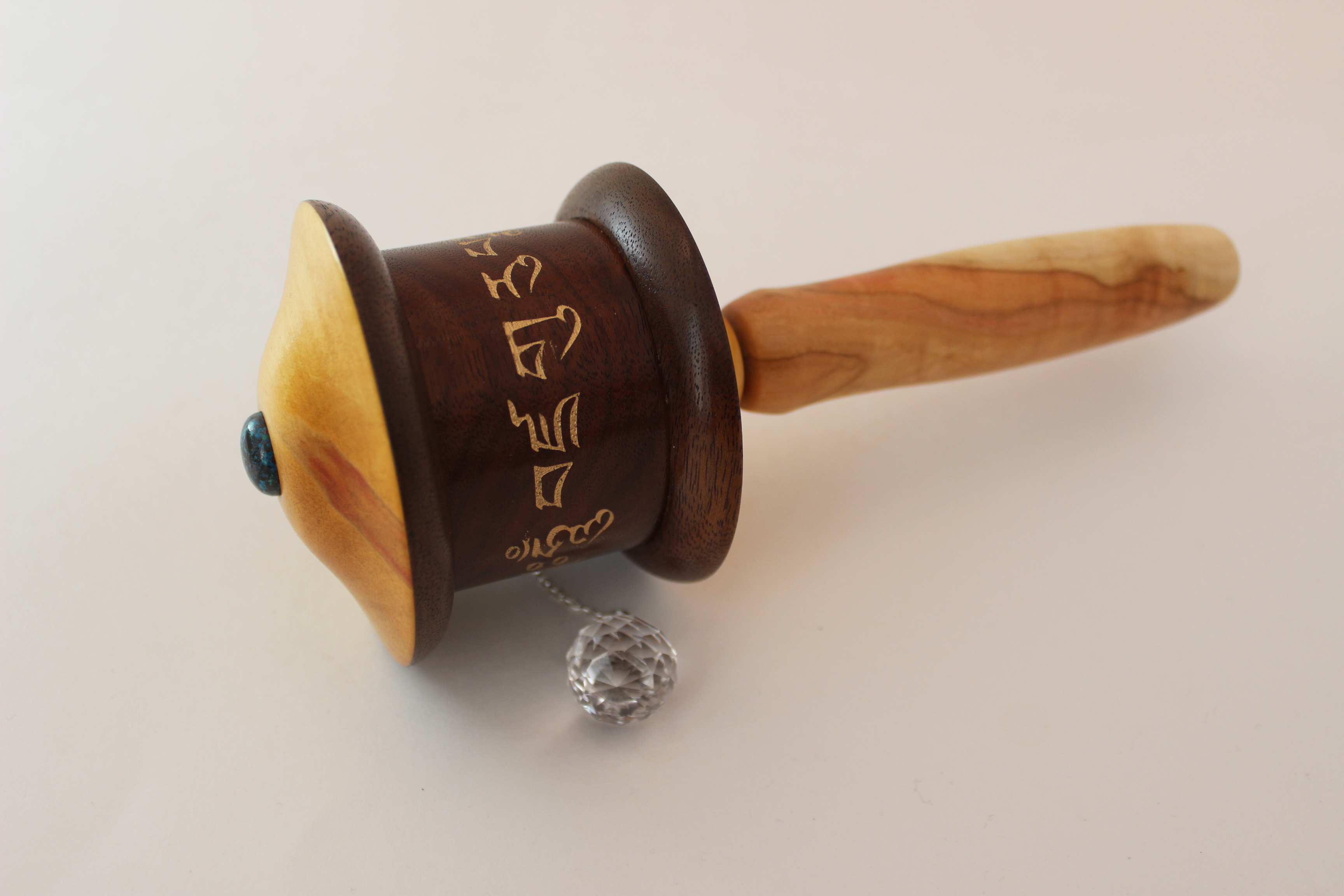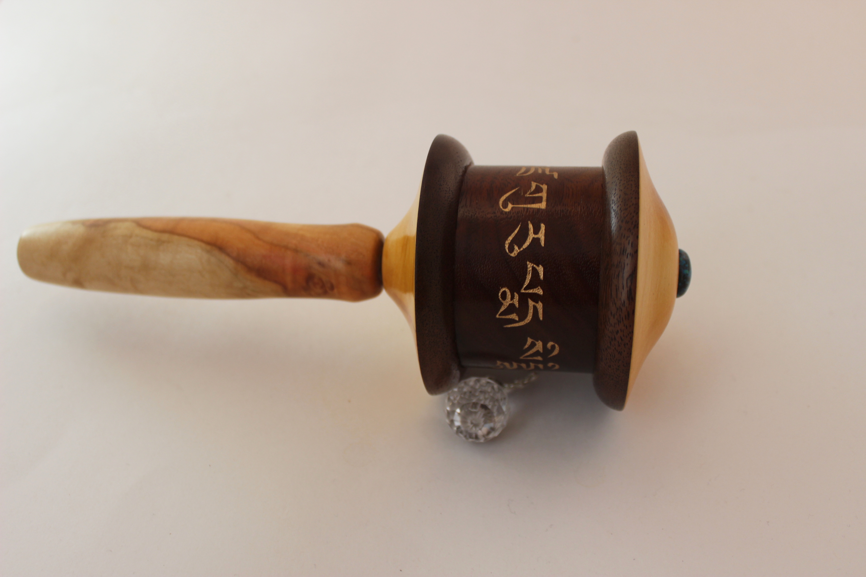 This is our standard size prayer wheel. The top, bottom and handle is made out of beautifully colored flame box elder wood, the barrel out of walnut wood sustainably harvested in our home state of Oregon.