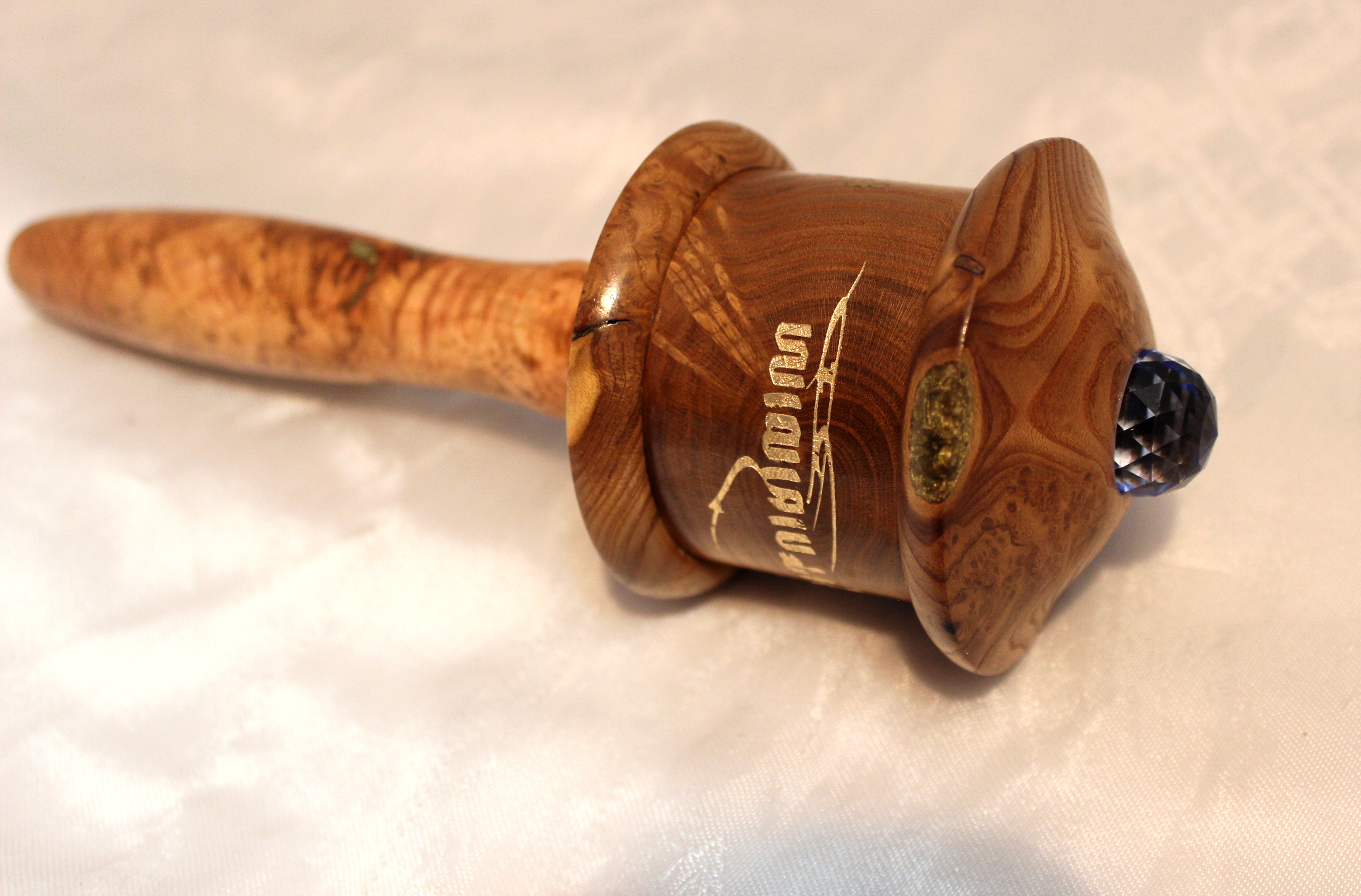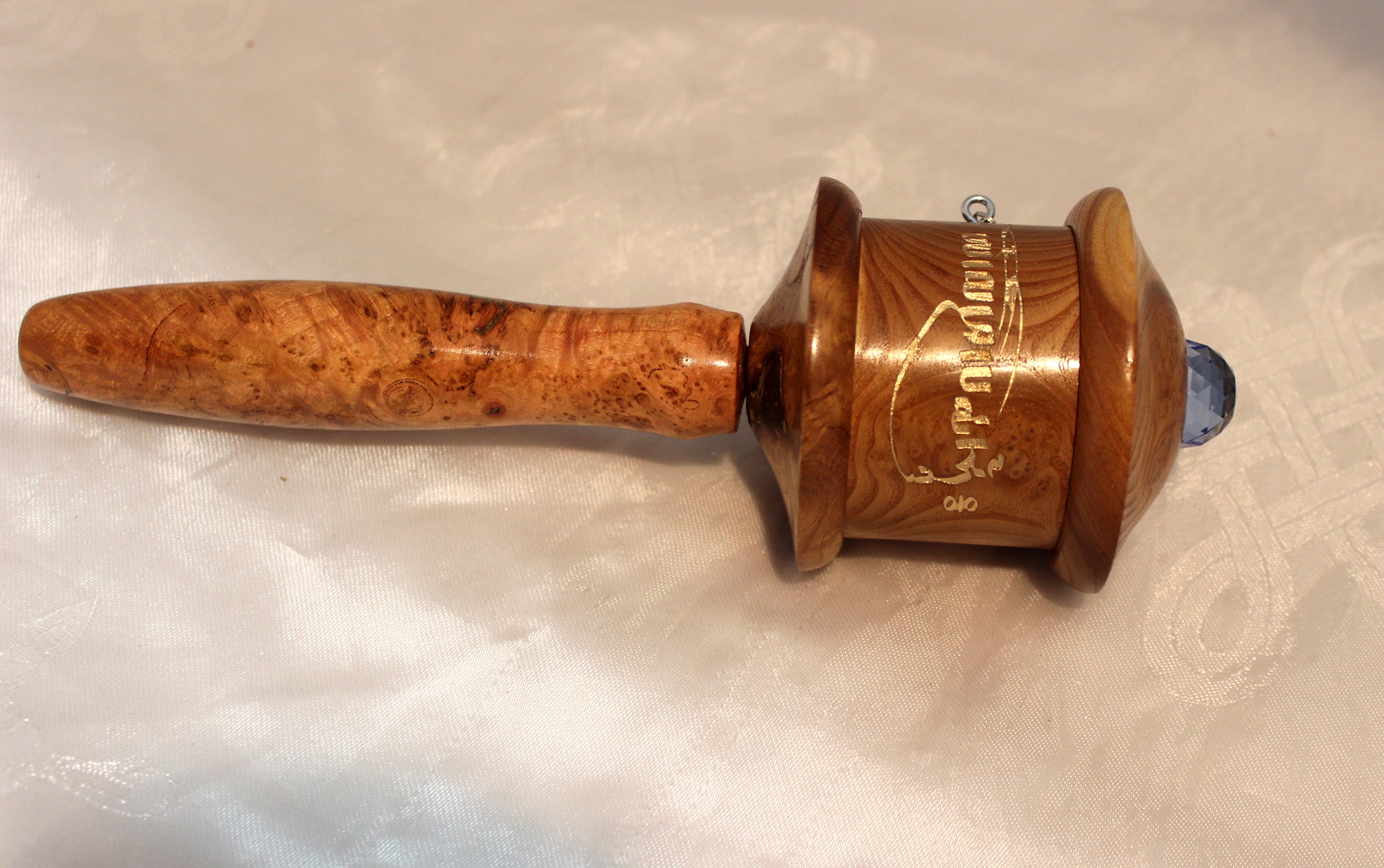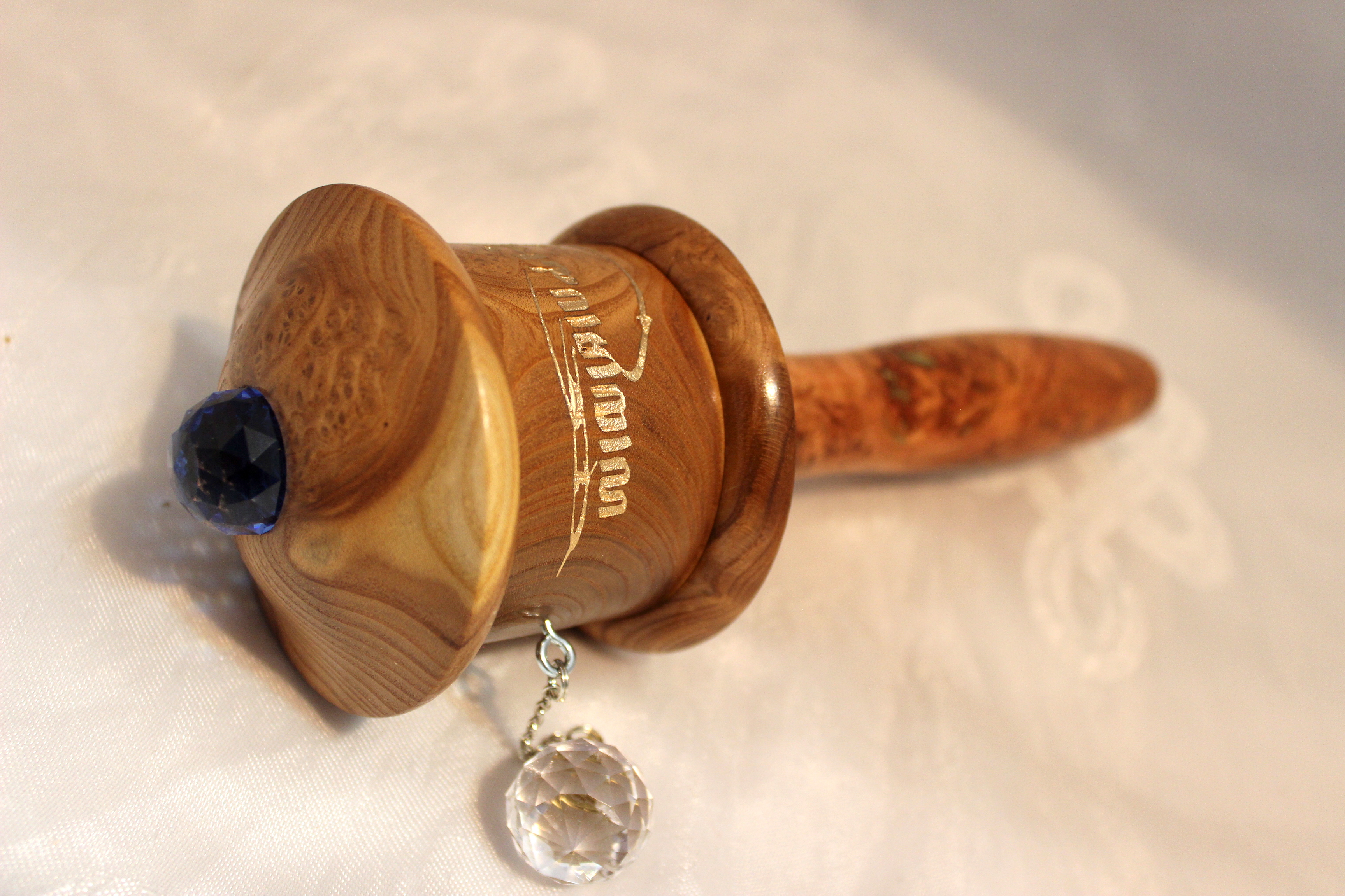 The top is crowned with a blue Swarovski crystal.