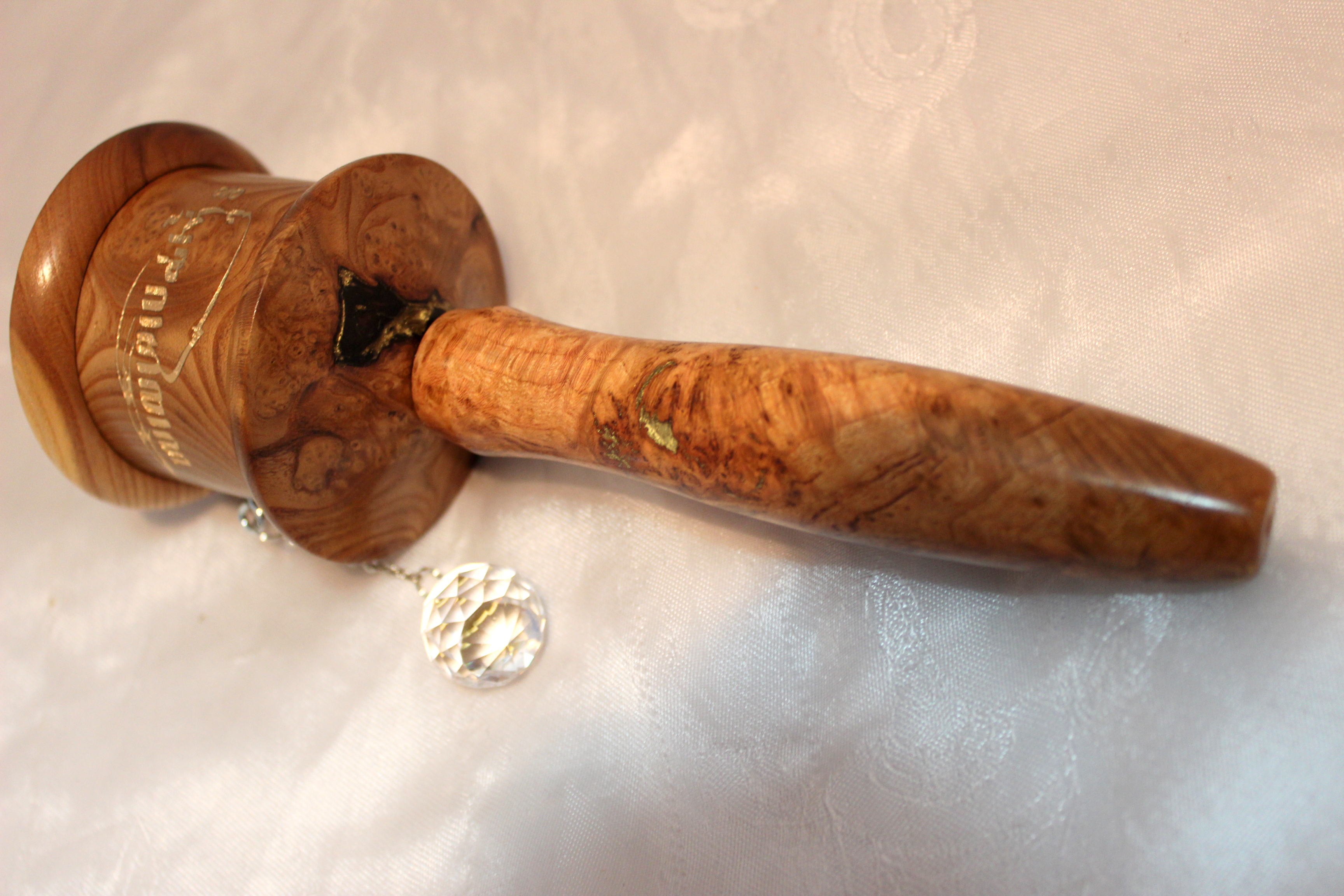 This is our mini size handheld prayer wheel is made from beautifully colored elm and cherry burl wood. Inside it contains 21 million Mani mantras, 1.5 million Green Tara mantras and 2 million Medicine Buddha mantras printed on microfilm. The engraving is Chenrezig mantra in cursive Tibetan.