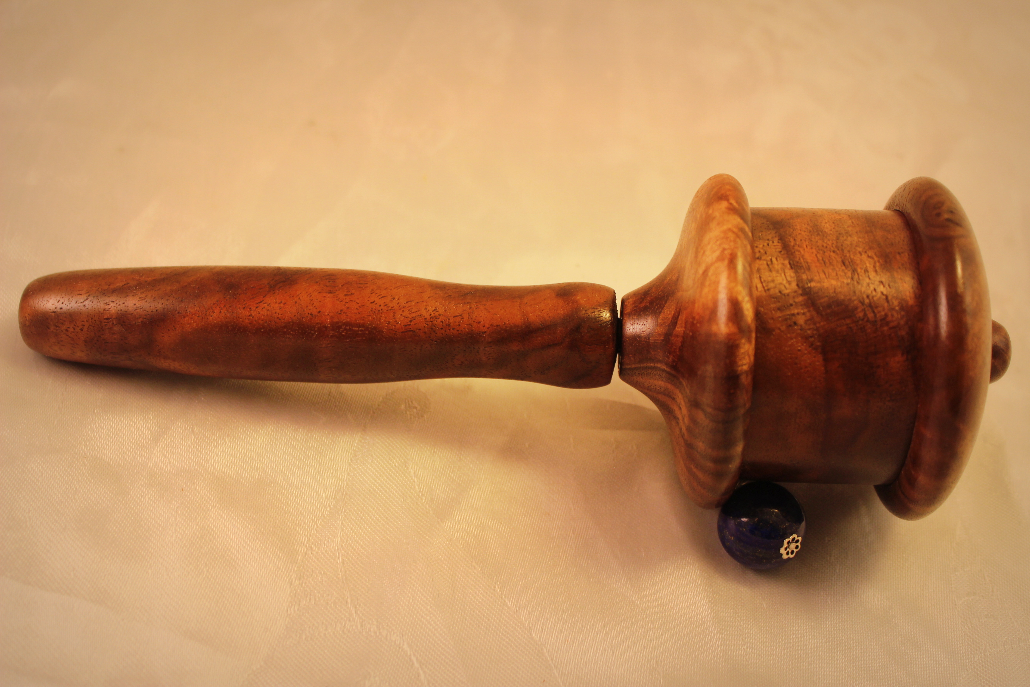 This is our mini size handheld prayer wheel. The mini is designed for portability and ease of use. It is perfect for people who take their prayer wheel everywhere with them, people with small hands, children or people who like a light prayer wheel.