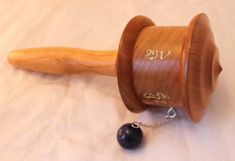 This prayer wheel is made out of Cherry wood sustainably harvested in our home state of Oregon. Inside it contains 18 million Mani mantras and 3.5 million Green Tara mantras printed on microfilm. It spins effortlessly on high quality lifetime ball bearings using a lapis lazuli as a spinner attached with a sturdy yet elegant chain.