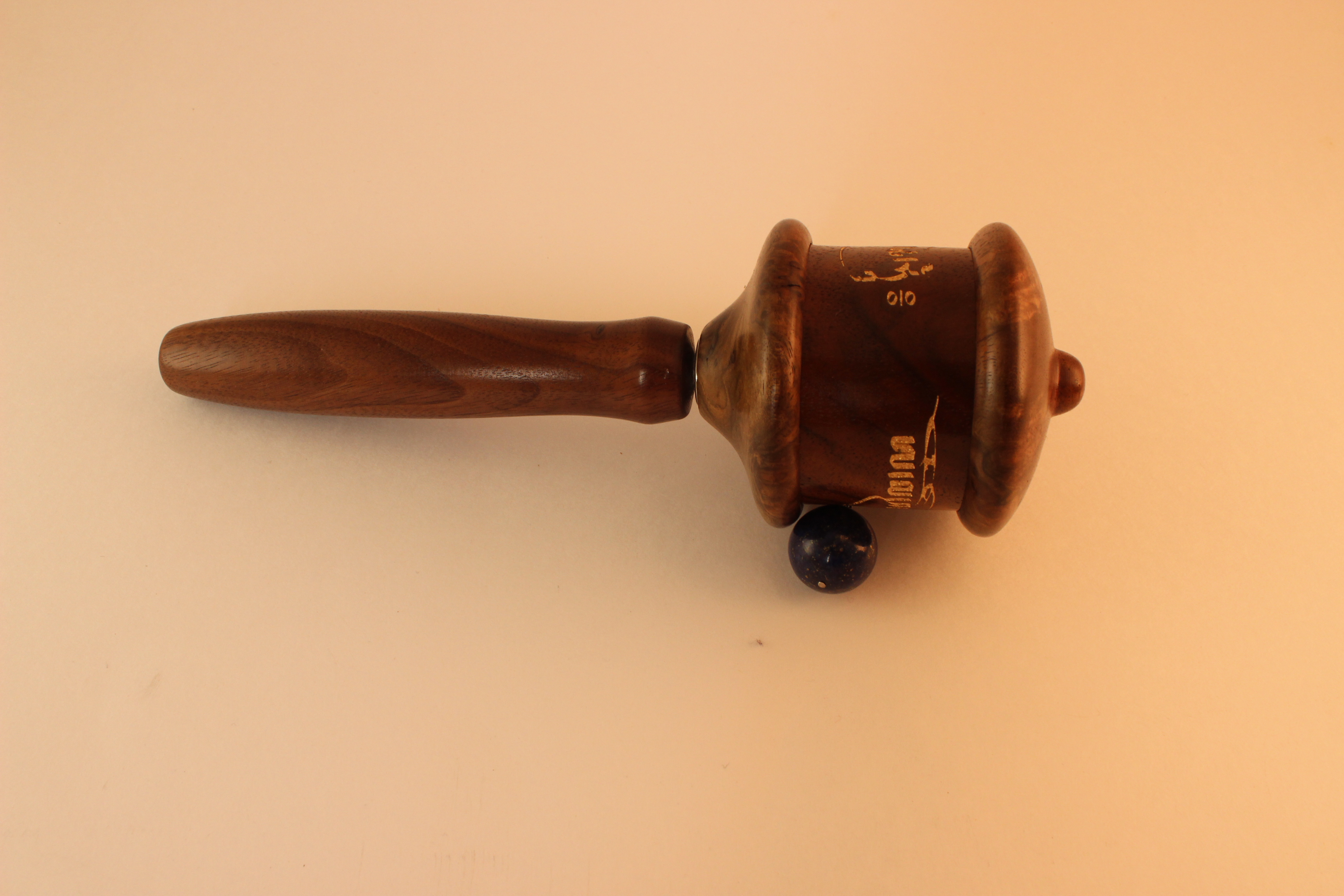 This is our mini size handheld prayer wheel. The mini is designed for portability and ease of use. It is perfect for people who take their prayer wheel everywhere with them, people with small hands, children or people who like a light prayer wheel.