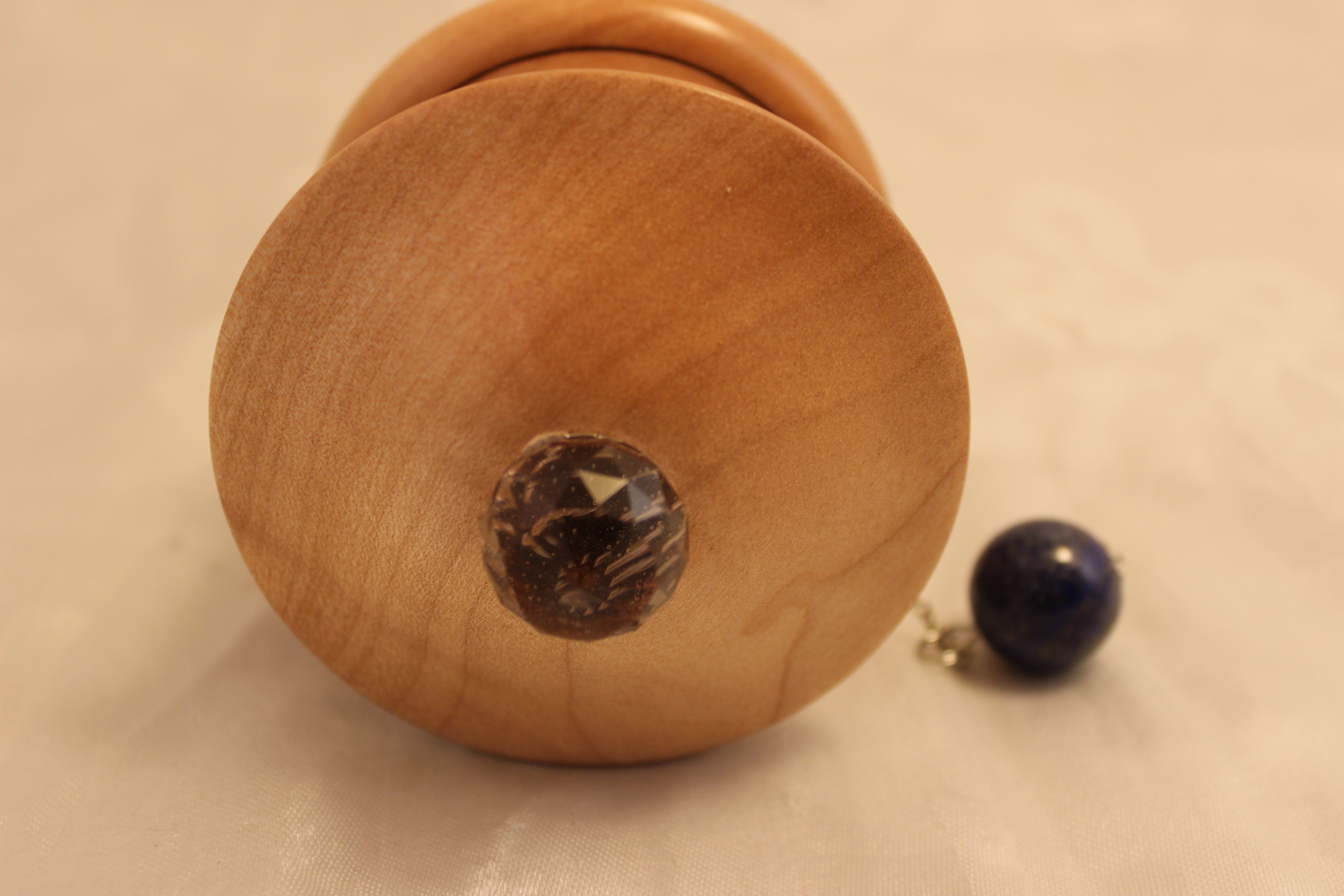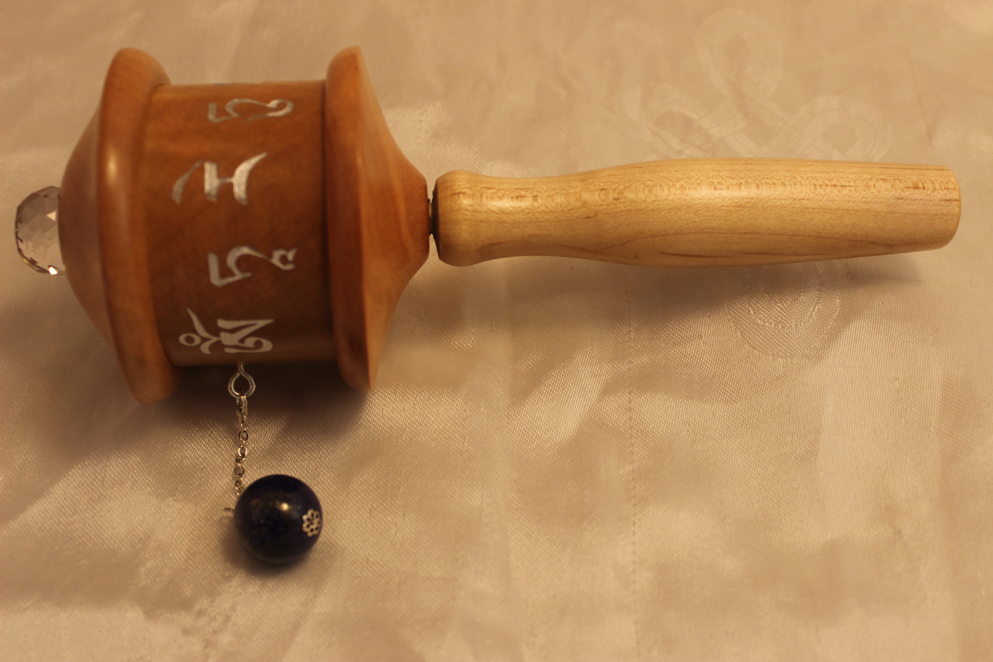 It spins effortlessly on high quality lifetime ball bearings using a lapis spinner attached with a sturdy yet elegant chain. The top is crowned with a faceted egyptian crystal. The silver colored engraving is the Green Tara mantra in tibetan.