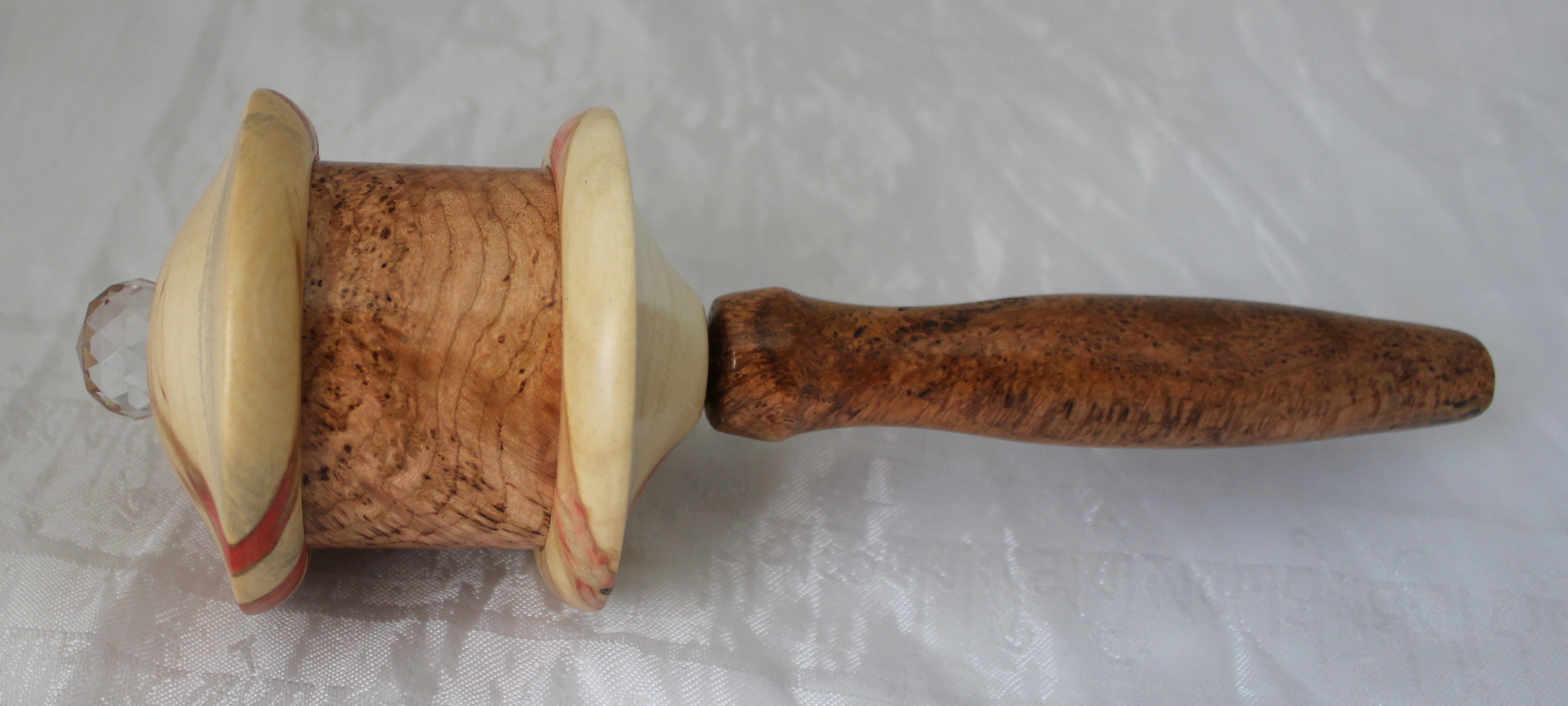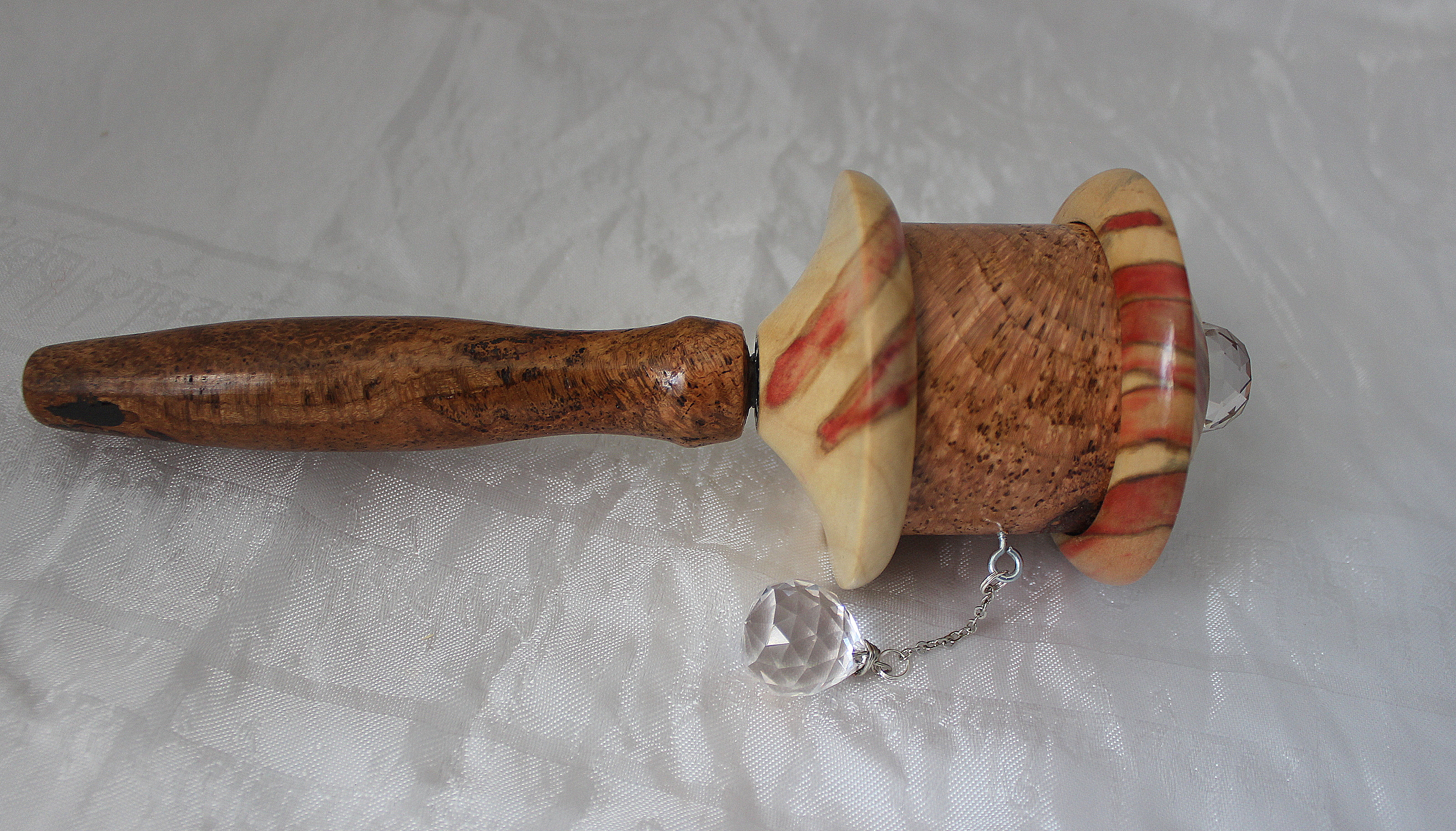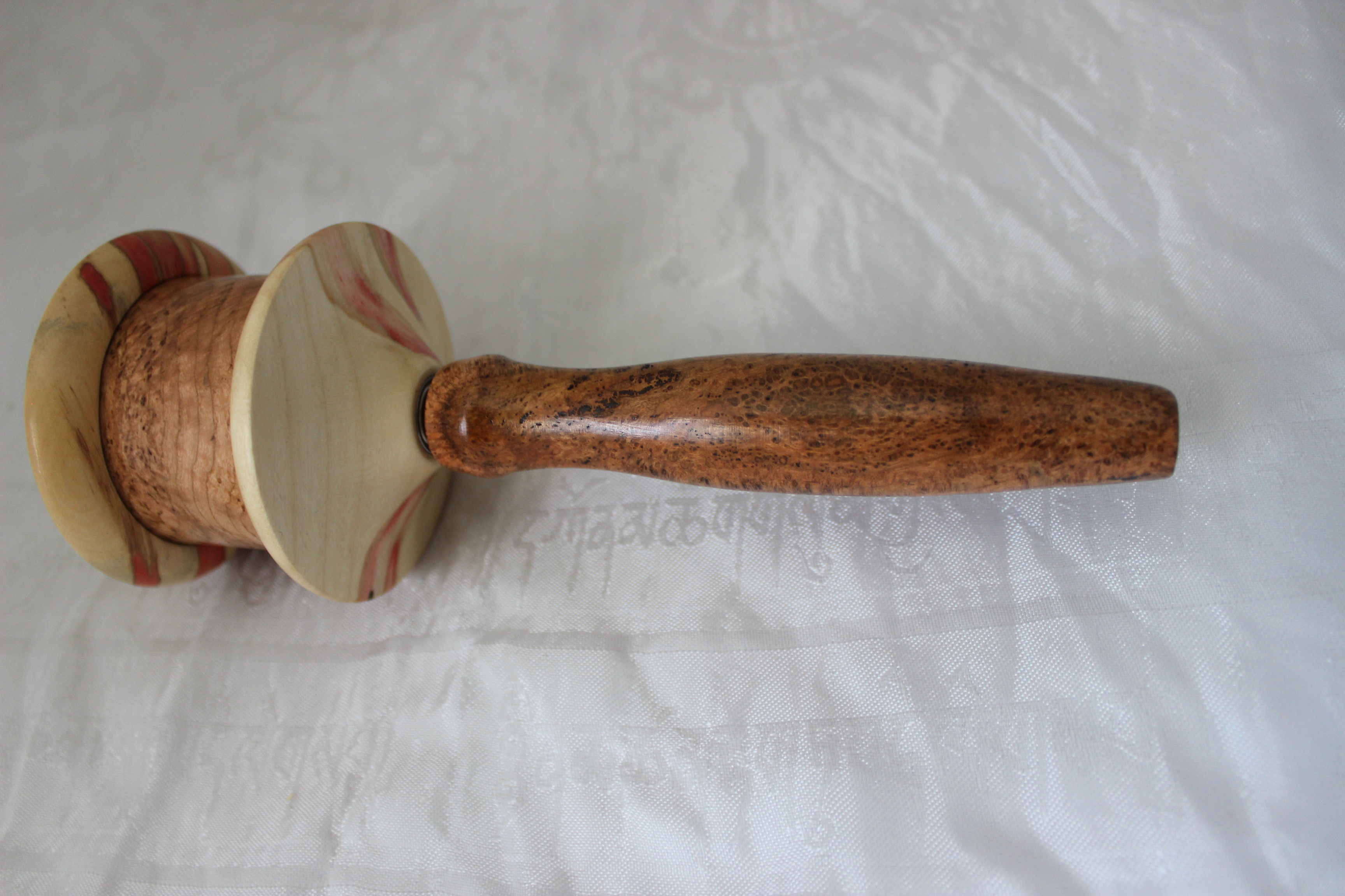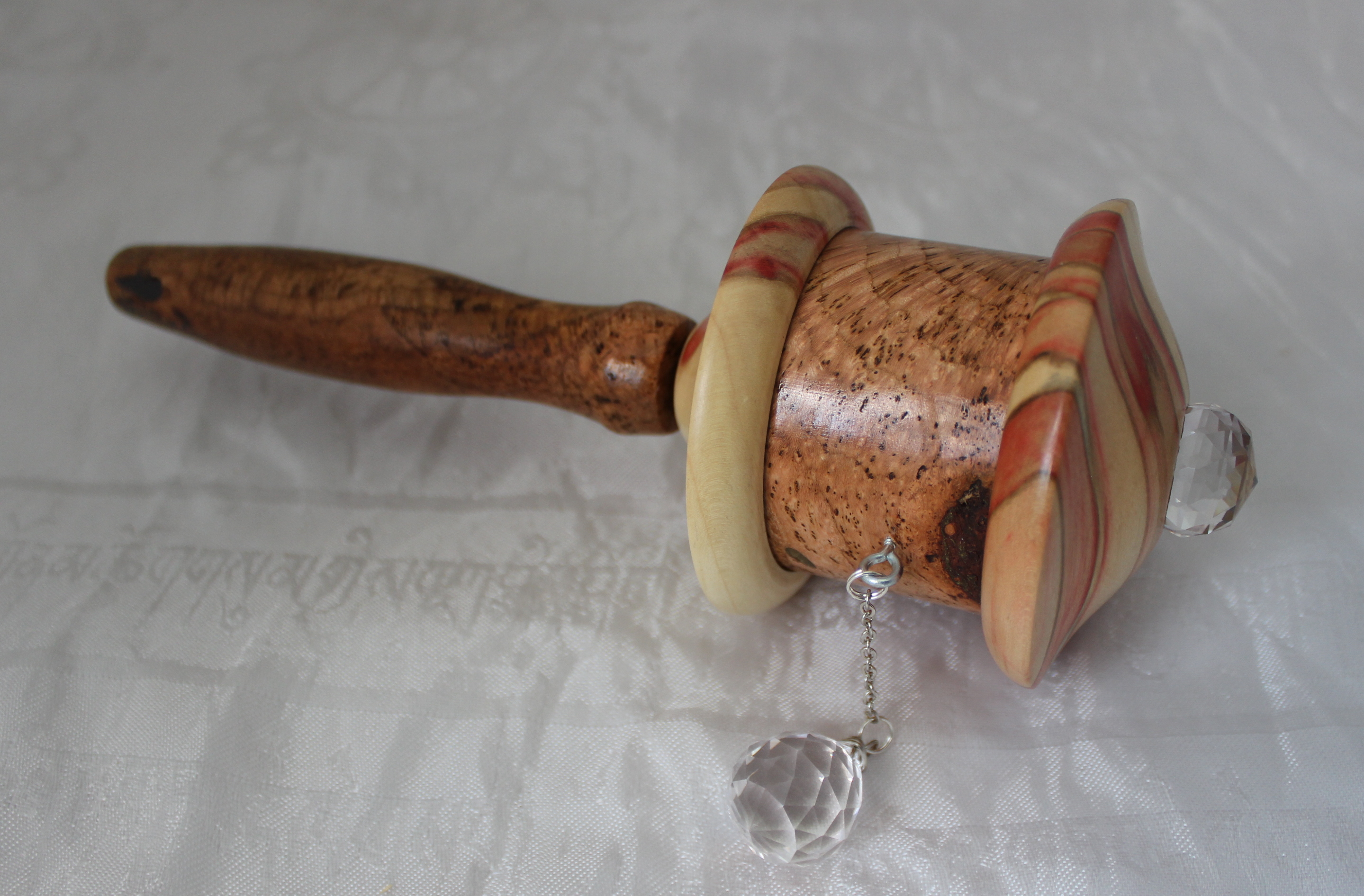 The barrel is made out of cherry wood, the top and bottom are made out of flame box elder wood, sustainably harvested in our home state of Oregon. Inside it contains 25 million Mani mantras and 2 million Green Tara mantras printed on microfilm. It spins effortlessly on high quality lifetime ball bearings using an egyptian crystal as a spinner attached with a sturdy yet elegant chain.